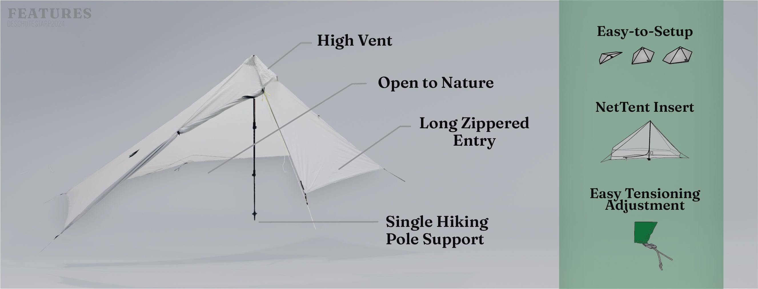 No floor. No pockets. Nothing but the essentials, the Deschutes gets the job done at an affordable price. At a mere 13 ounces, this pyramid-style design is incredibly stable providing 360° protection is some of the most extreme conditions. The Deschutes gives any hiker the freedom to move fast and light without sacrifice.